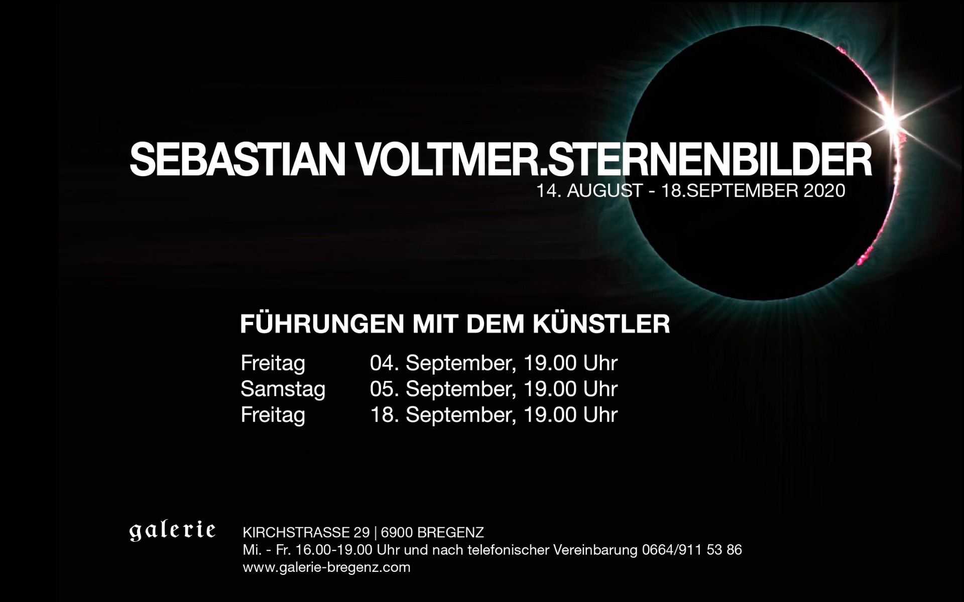 In dieser Ausstellung präsentiert der Künstler Handabzüge auf Ilfochrome, Unikate kosmischer Kompositionen, Langzeitbelichtungen auf Leinwand, sowie Aufnahmeserien aus dem Millisekundenbereich von durch die Erdatmosphäre in Farben zerlegte Sonnen.